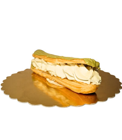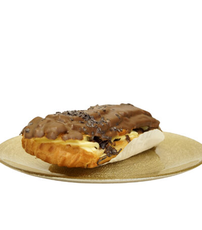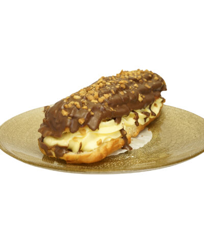 Imbina finetea eclerului cu bogatia aromei de ciocolata. Blatul sau pufos si aerat este umplut cu o crema de vanilie si ciocolata, acoperit cu o glazura de ciocolata care adauga o nota suplimentara de dulceata. Aceasta combinatie clasica ofera o experienta delicioasa pentru iubitorii de ciocolaa si pasionatii de eclere
