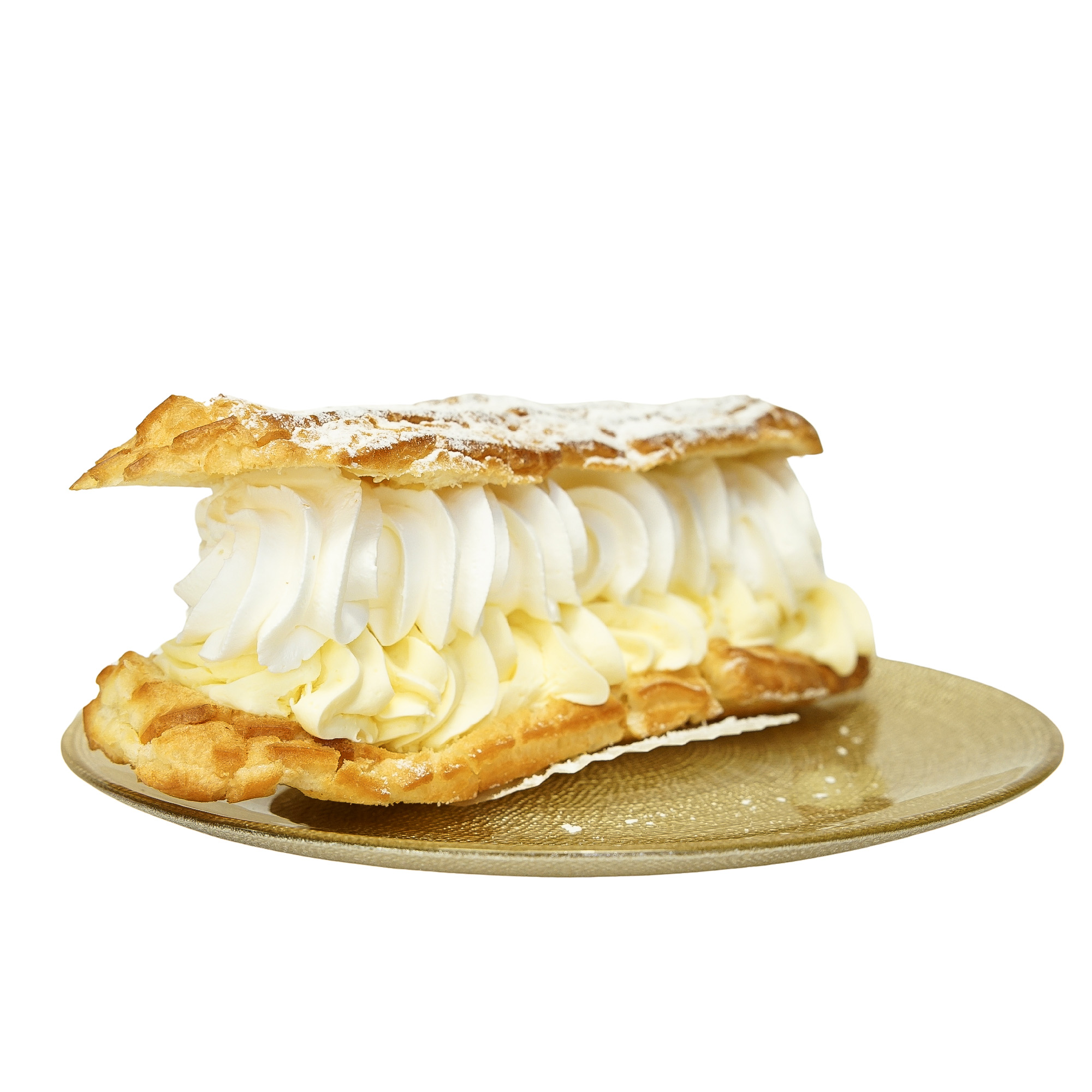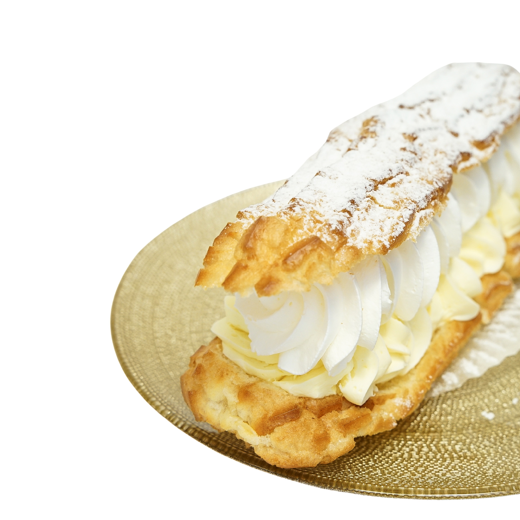 Este o imbinare delicioasa a blandului ecler cu prospetimea si fina textura a friscii. Blatul pufos si aerat este umplut cu o crema fina de vanilie si frisca, oferind o experienta dulce si racoritoare. Este o alegere apreciata pentru cei care cauta un desert proaspat si indulgent.